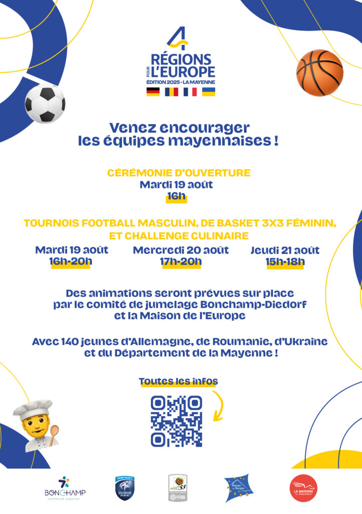 Le projet « Quatre Régions pour l’Europe », lancé en 2020, célèbre l’amitié entre la Mayenne (France), le Bezirk de Souabe (Allemagne), Suceava (Roumanie) et Tchernivtsi (Ukraine). Né de liens historiques entre la Mayenne et la Souabe, ce partenariat s’est élargi pour inclure ces quatre régions européennes, unies autour de la jeunesse, du sport et de la citoyenneté. Chaque année, les jeunes de ces territoires se retrouvent pour des tournois interculturels dans l’un des quatre pays. En 2025, c’est au tour de la Mayenne d’accueillir l’évènement !